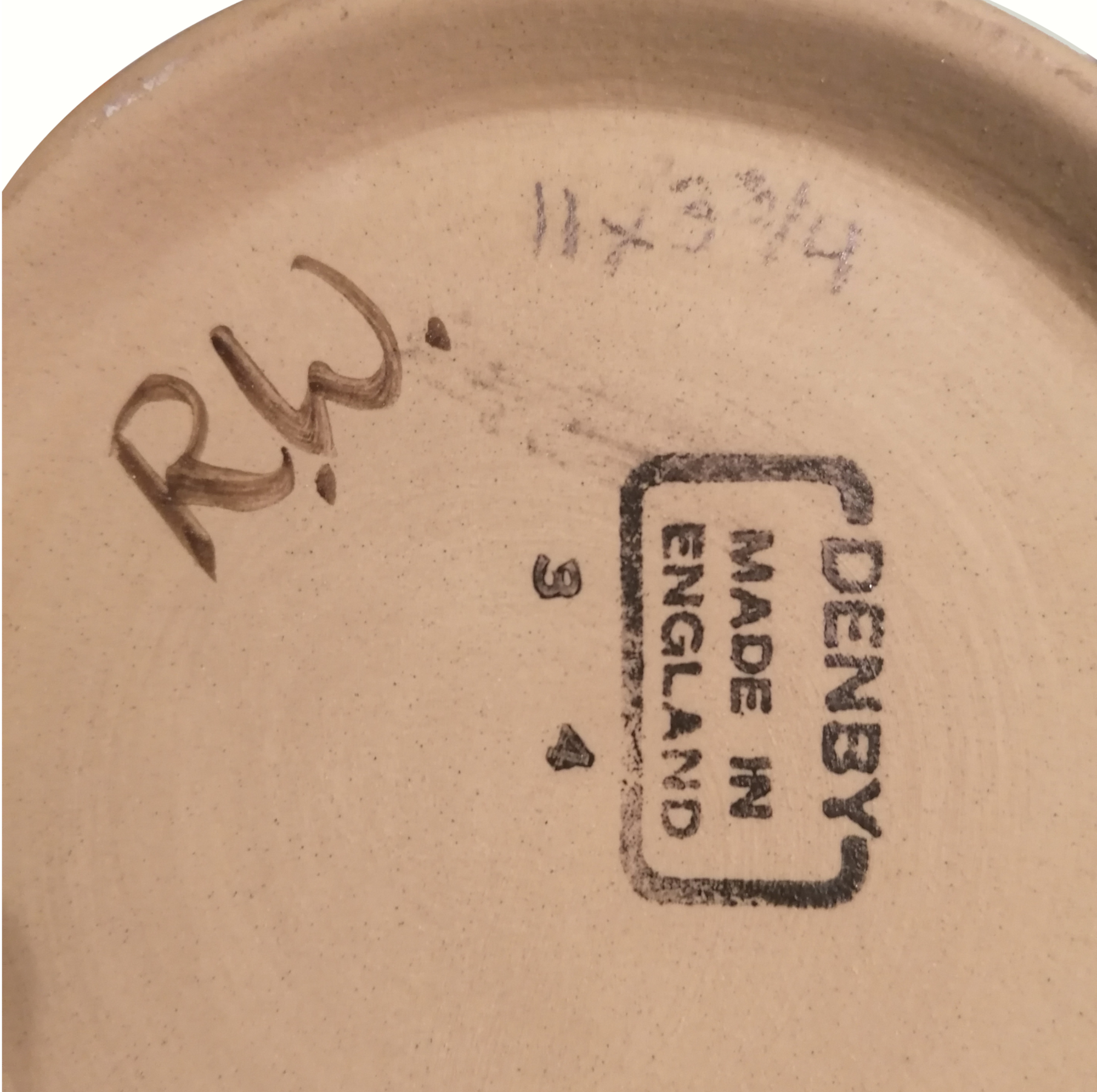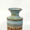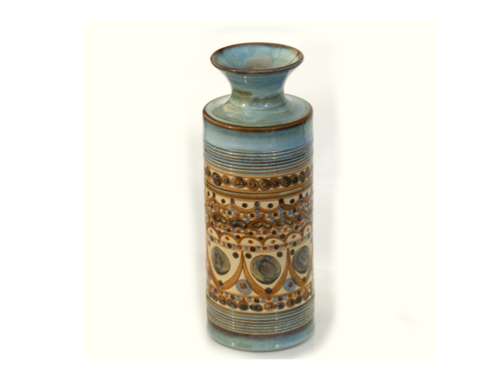 A Denby Cylindrical Minaret Vase, designed by David J Yorath. Decorated with shades of tan and brown on a blue ground,
