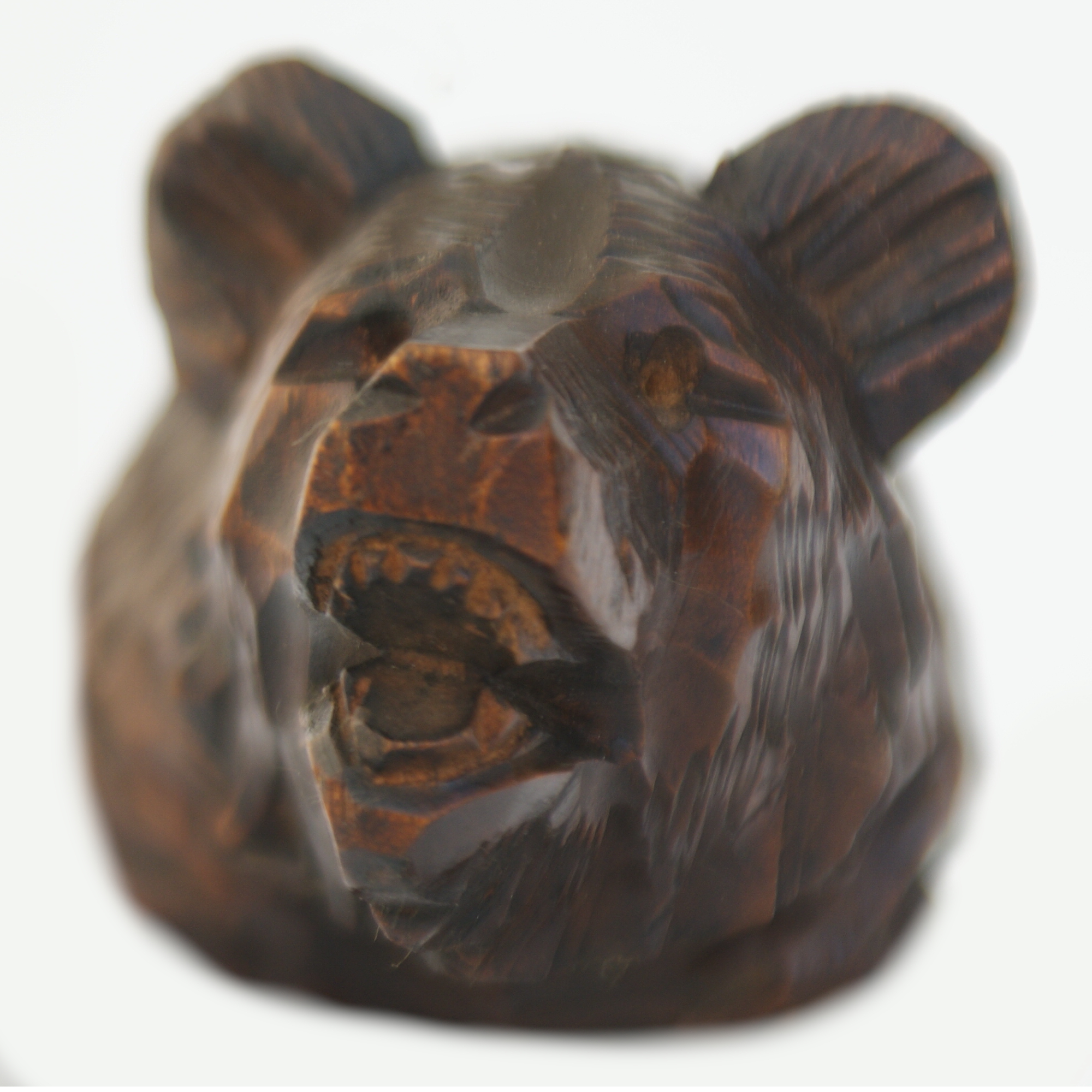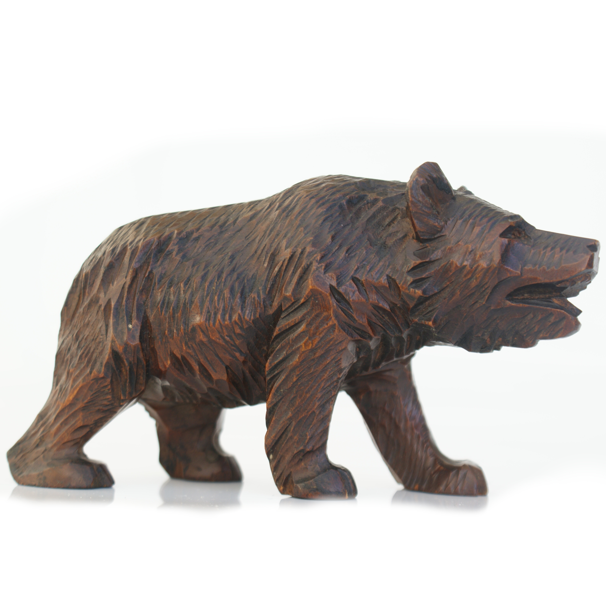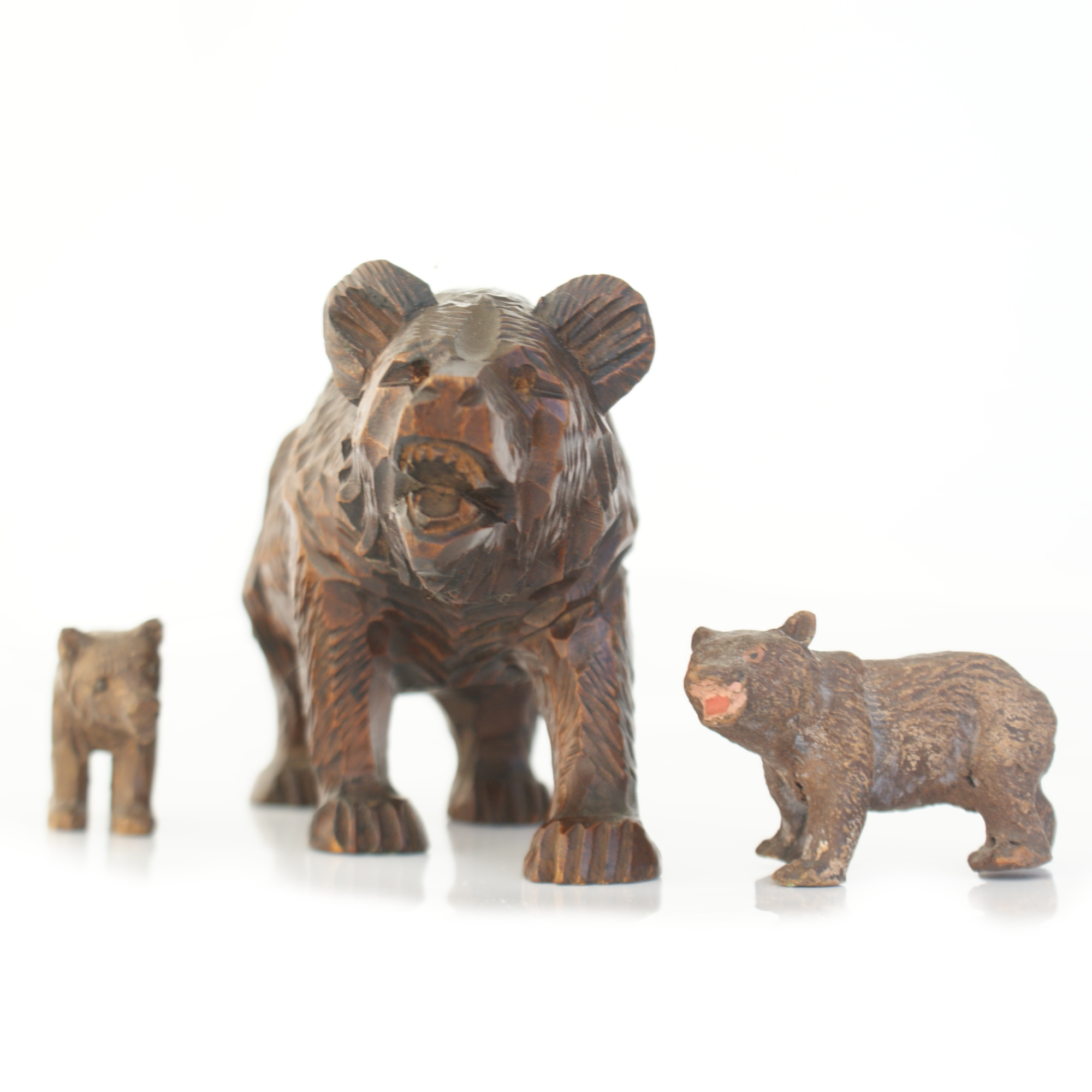 Three Black Forest bears, Larger Bear and two cubs. The Larger Bear stands walking forward, mouth open. The cubs stood with interested expressions.