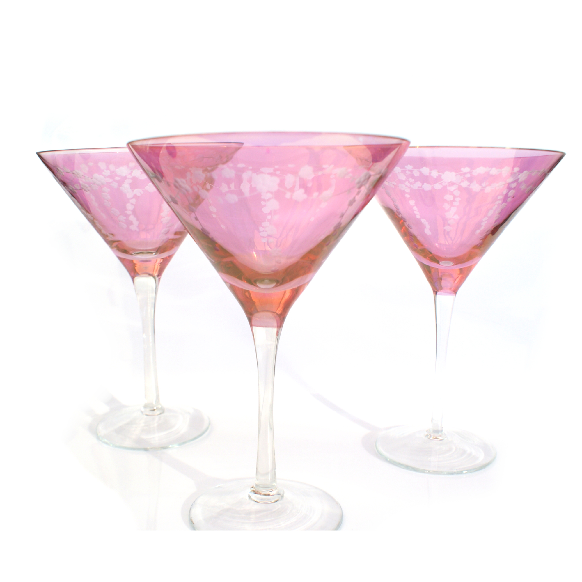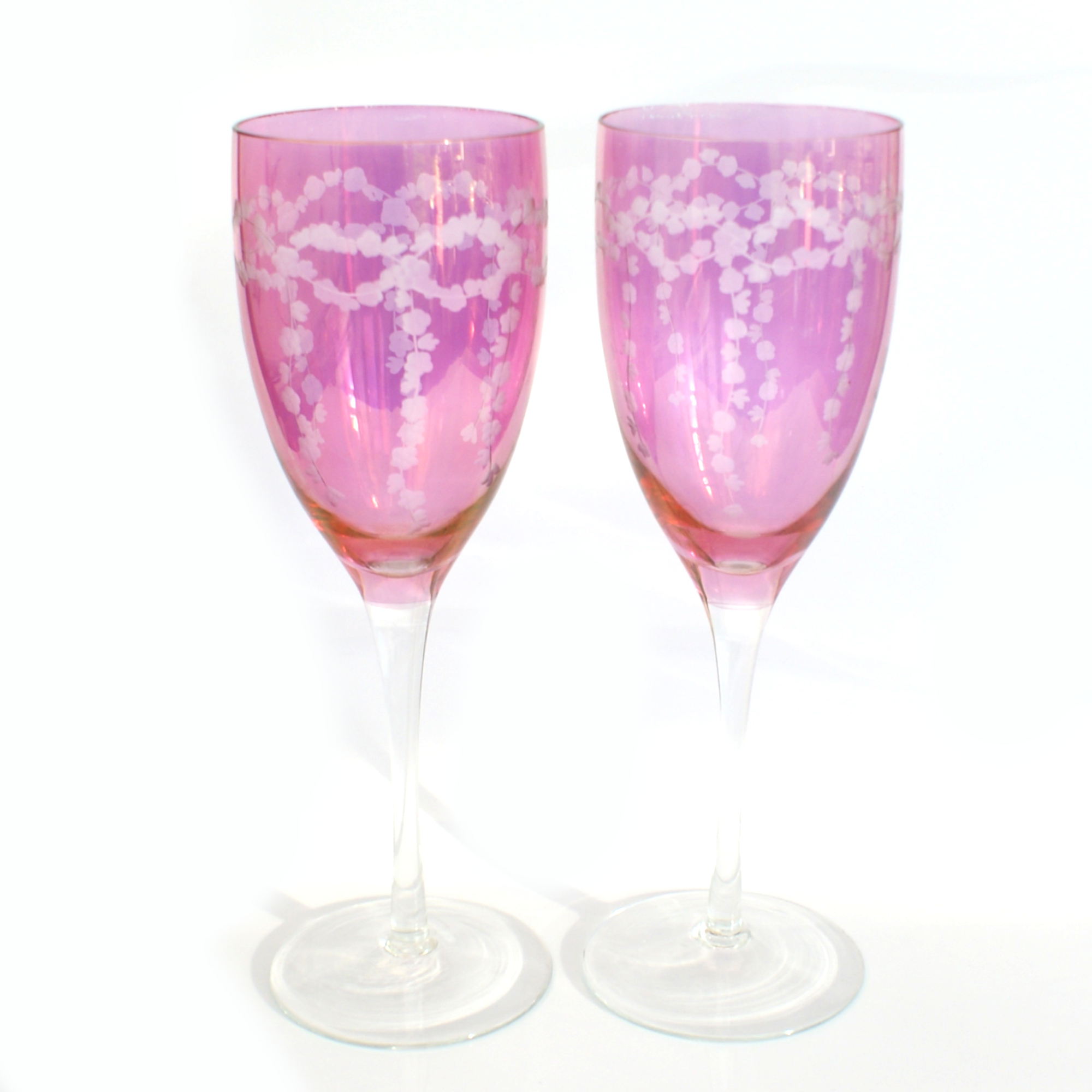 A very attractive group of five drinking glasses, three Cocktail glasses in pink with drooping vine etched decoration, the two wine glasses decorated the same. ( Maker Unknown).